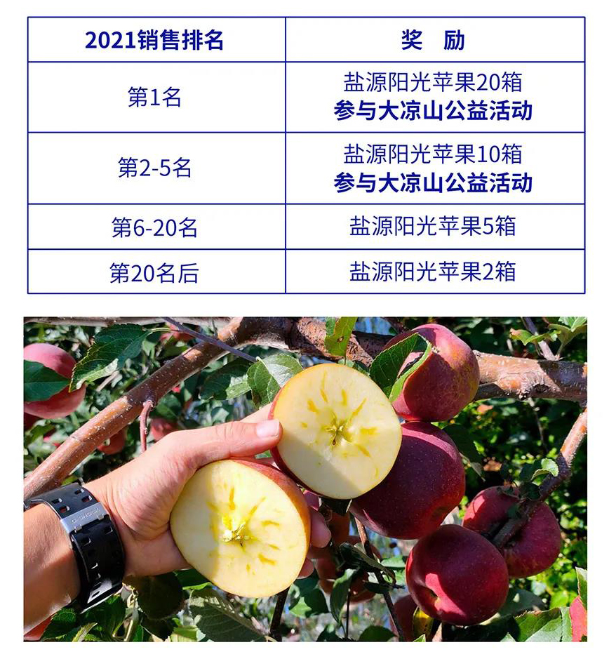 凡在2021年1月1日至2021年9月30日期間,有交易記錄的普愛(ài)會(huì)員,按照銷售排名可領(lǐng)取不同數(shù)量的鹽源陽(yáng)光蘋果。(以全款到賬時(shí)間結(jié)算)