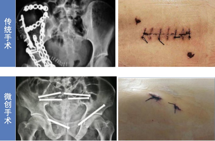 如上圖對比,相比于傳統手術,使用骨科手術機器人(PL300B)的手術傷口由前后各30厘米的切口變成2厘米左右的小切口,手術時間縮短50%以上,出血量減少95%以上,手術并發癥發生率大大減少。